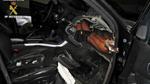 Seguidamente efectuaron un registro exhaustivo del interior del vehículo hasta llegar al salpicadero, instante en que, al introducir el guardia civil una mano en su interior, palpó el cuerpo de una persona, tras lo que de forma inmediata se arrancó parte del frontal para poder extraerlo y auxiliar a la persona que se hallaba en su interior.