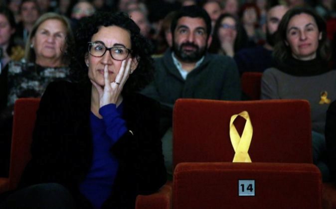 La secretaria general de ERC y número dos en la lista, Marta Rovira, junto a un asiento vacío dedicado al exvicepresidente de la Generalitat encarcelado, Oriol Junqueras.