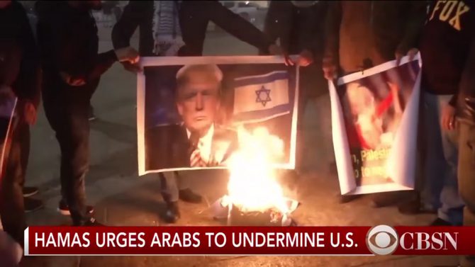 El puñado de palestinos filmados en Belén quemando imágenes del presidente de EEUU, Donald Trump, el pasado 6 de diciembre fueron presentados por los medios como si fueran parte de protestas masivas en las comunidades palestinas. (Imagen: captura de un vídeo de CBS News).