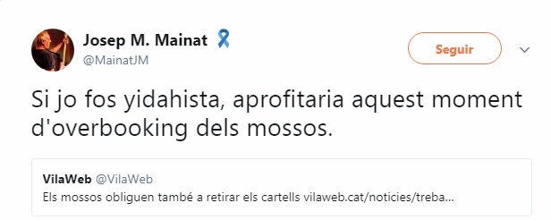 Hace unos días uno de los digitales catalanes subvencionados con fondos públicos contó que, siguiendo indicaciones de la Junta Electoral, los Mossos habían retirado carteles separatistas en instituciones públicas. Mainat decidió entonces dar una idea a los terroristas islámicos: