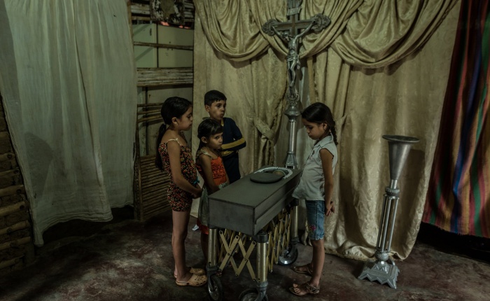 Se podían ver claramente la espina dorsal y las costillas de Kenyerber mientras le inyectaban los químicos de embalsamar. Las tías intentaban mantener alejados a los primitos curiosos. Sus familiares llegaron con flores y reutilizaron cajas de alimentos que reparte el gobierno a través de los Comités Locales de Abastecimiento y Producción (CLAP), de las que dependen cada vez más los venezolanos ante la escasez de comida y los precios altísimos, para recortar dos pequeñas alas de cartón. Las pusieron cuidadosamente encima del ataúd de Kenyerber, una práctica común entre los venezolanos, para que su alma pueda alcanzar el cielo.