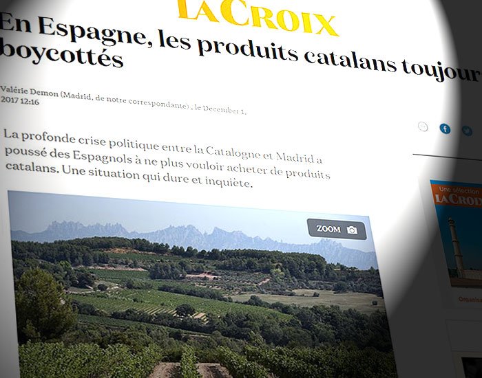 La Croix asegura que la “profunda” crisis política entre Cataluña y Madrid ha empujado a los españoles a no querer comprar productos catalanes. Y apunta que esto se añade al impacto provocado por el cambio de residencia fiscal y social fuera de la región de miles de empresas. Se hace eco de los mensajes que circulan por redes sociales “animando” a no adquirir productos made in Cataluña y apunta que la situación inquieta tanto a los empresarios que hasta el presidente del gobierno Mariano Rajoy ha pedido públicamente que no se dejen de comprar estos productos. En este sentido se cita a Josep Bou, presidente de Empresaris de Catalunya, patronal que agrupa a unos 500 hombres de negocios opuestos a la independencia, que señala que aunque se ha “estabilizado, el boicot continúa”.