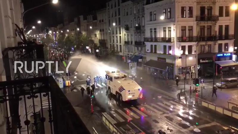 Con cañones de agua, policías antidisturbios tratan de hacer retroceder a unos vándalos en el centro de Bruselas, Bélgica, el pasado 12 de noviembre. Cientos de “jóvenes” de origen foráneo ‘celebraron’ la clasificación de Marruecos para el mundial de fútbol provocando altercados e hiriendo a 22 policías. (Imagen: captura de un vídeo de Ruptly).