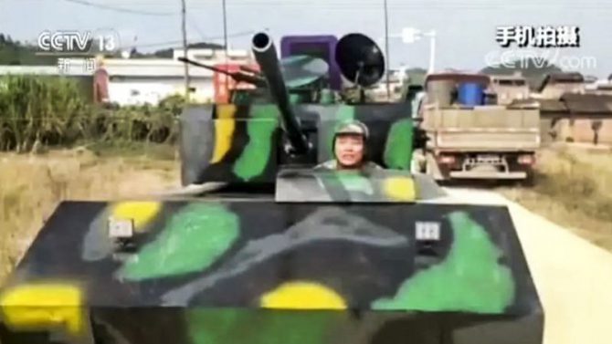 Huang había pasado dos meses renovando una antigua camioneta, a la que añadió una carrocería de camuflaje y un cañón -en principio, no diseñado para disparar-, para poder circular con su soñado tanque, cosa que hizo disfrazándose de soldado con casco incluido.