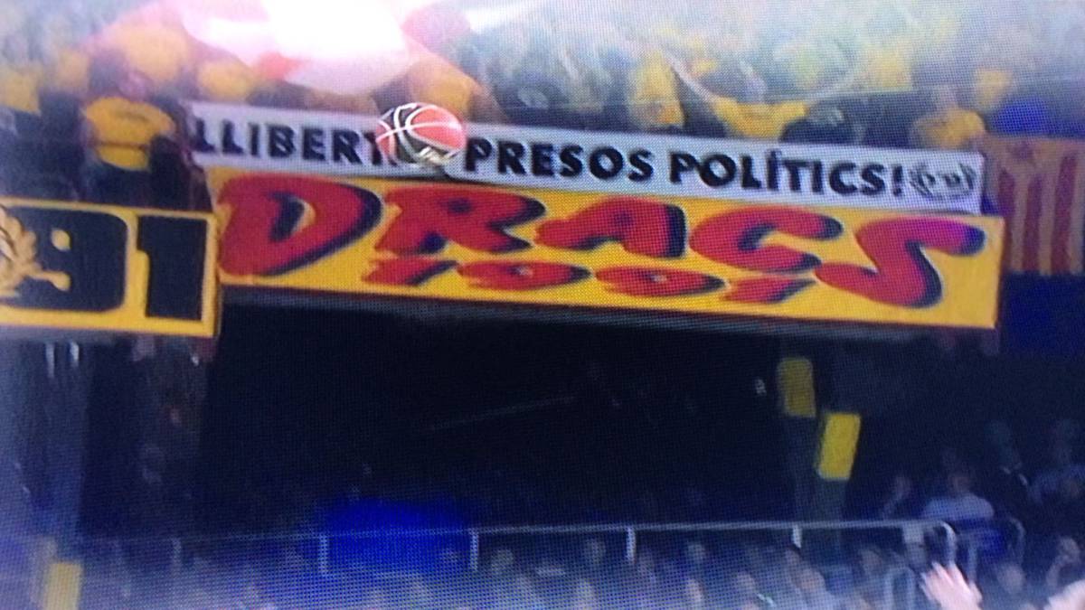 Sucedió en el tramo final del tercer cuarto del partido que enfrentaba al Real Madrid y al Unicaja, pero es una de las imágenes con las que se ameniza la retransmisión televisiva de la Copa del Rey que ayer echó a andar en Gran Canaria. Con 58-60 a favor de los malagueños y 2:43 aún por jugar de ese tercer período, se dio paso a la publicidad. Y ahí, se coló un imagen con mensaje extradeportivo: “Llibertat Presos Polítics!”, junto a la pancarta de los Dracs, los aficionados más ruidosos del FC Barcelona, según cuenta As.