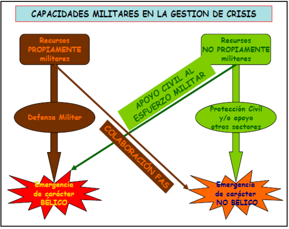 El empleo de las capacidades militares para la resolución de una crisis puede tener dos modelos diferentes según la emergencia o situación que da origen a ella requiera o pueda requerir el empleo de la Fuerza, o bien teniendo un carácter no bélico precisa de la contribución de las capacidades militares.
