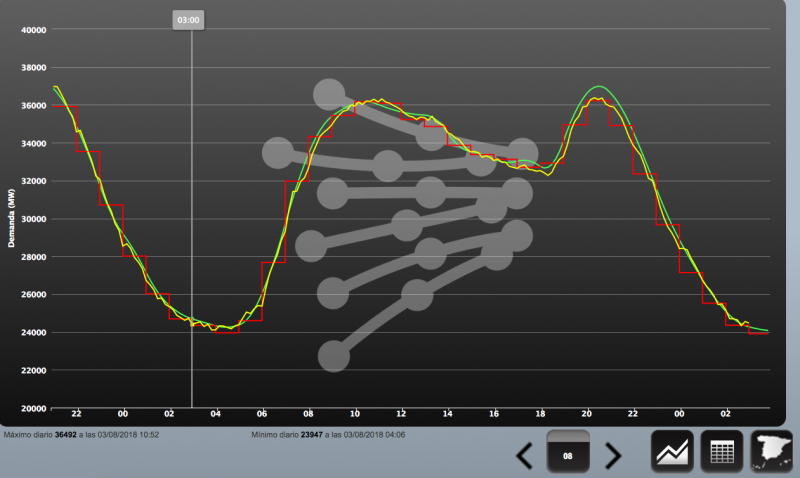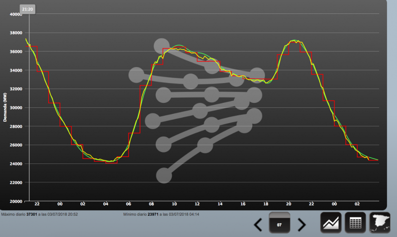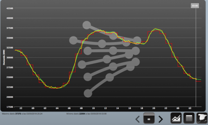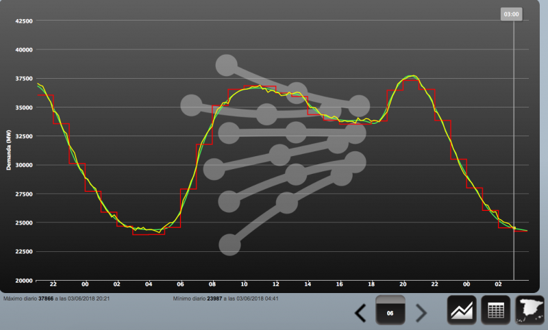 Concretamente, el consumo de energía en España los días 5, 6, 7, 8 y 9, con mediciones en megavatios realizadas a las 8.00 horas, las 12.00 horas y las 20.00 horas, fue el siguiente: 5 de marzo (32.212 – 36.240 – 37.087); 6 de marzo (33.326 – 36.254 – 37.400); 7 de marzo (33.529 – 35.589 – 36.754); 8 de marzo (32.638 – 37.732 – 35.926); 9 de marzo (32.744 – 35.040 – 34.763).