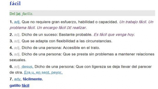 Hasta ahora, la quinta acepción de la palabra «fácil» indicaba «dicho especialmente de una mujer: Que se presta sin problemas a mantener relaciones sexuales»; con la modificación, que ya es efectiva online, aparece: «dicho de una persona: Que se presta sin problemas a mantener relaciones sexuales».