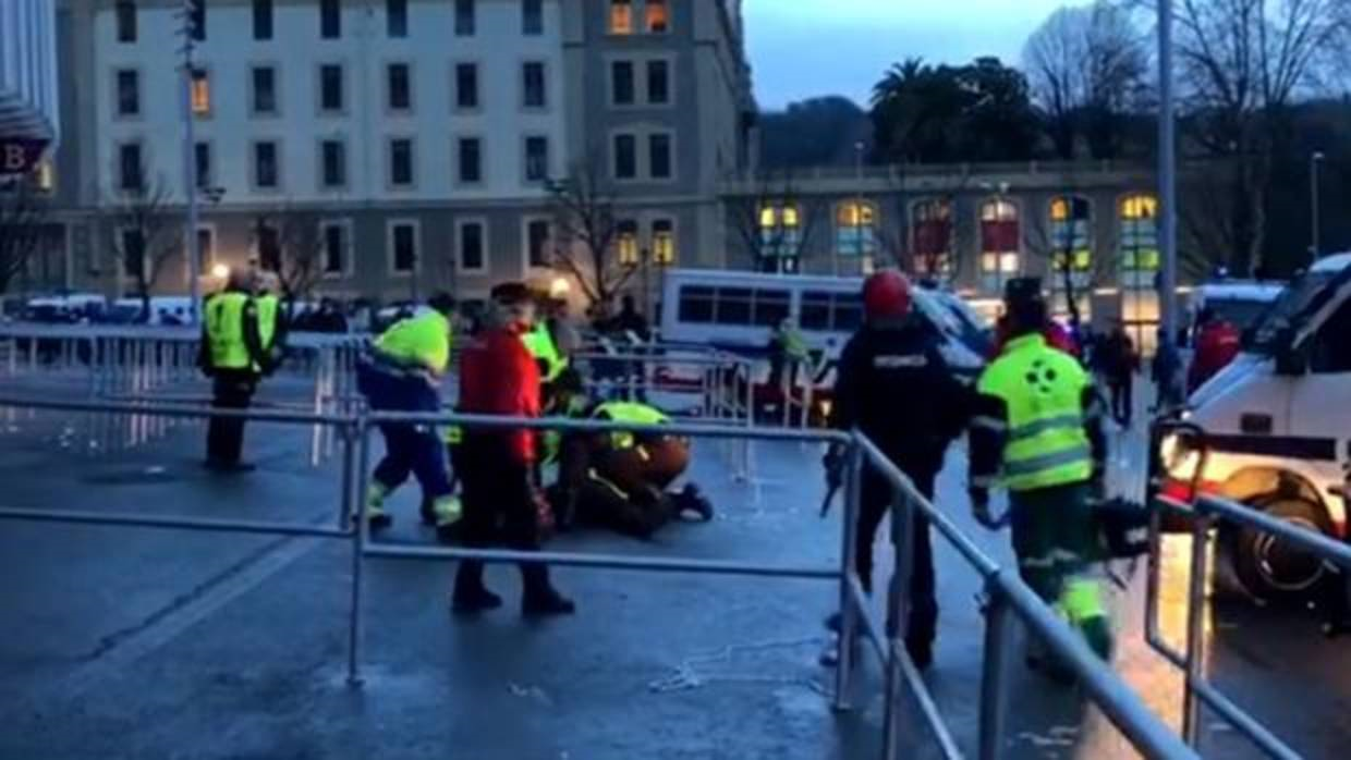 Según las primeras informaciones de la Ertzaintza, aún sin corroborar, el vigilante habría llamado la atención a unos aficionados del Marsella y ha sido agredido.