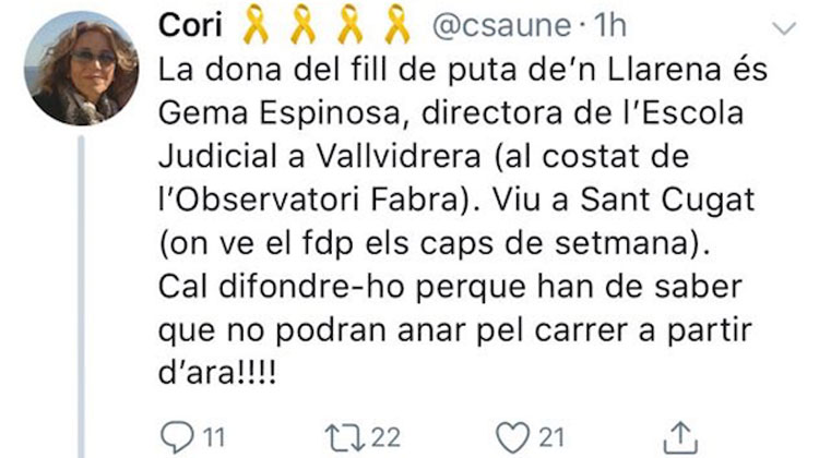 “La mujer del hijo de puta de Llarena es Gema Espinosa, directora de la Escuela Judicial en Vallvidrera (al lado del Observatorio Fabra). Vive en Sant Cugat (donde vive el fdp los fines de semana). Hay difundirlo porque deben saber que no podrán ir por la calle a partir de ahora”, publicó la usuaria de twitter tras la detención de Puigdemont en Alemania.