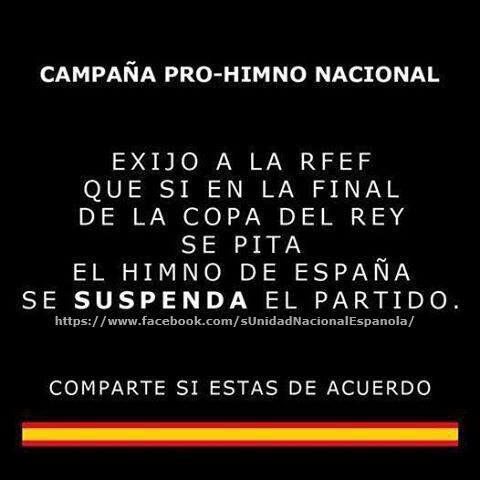 “Exijo a la RFEF que si en la final de la Copa del Rey se pita el himno de España se suspenda el partido”, ha expuesto en un breve mensaje en Twitter, al que ha llamado retuitear.