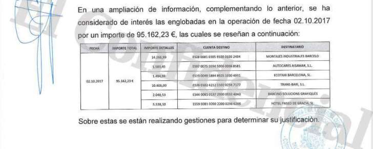 Otro dato significativo de este nuevo informe, hasta ahora secreto, es el que afecta a los gastos de la cuenta del Diplocat. Las pesquisas han podido determinar que el organismo utilizaba una depósito en CaixaBank y ha detectado más de 95.000 euros sospechosos que se gastaron el 2 de octubre, un día después del referéndum. En esa jornada se realizaron transferencias simultáneas a dos empresas de montaje industriales, otra de autocares, un servicio de taxis, una compañía de diseñadores gráficos y el Hotel Paseo de Gracia, donde se transfirieron nada menos que 5.538 euros. El informe también reseña el pago con una tarjeta de crédito vinculada a Diplocat de los gastos de los observadores internacionales los vuelos, la estancia y la manutención de una treintena de personas, identificadas como observadores y acompañantes. El importe total fue de 40.591 euros.