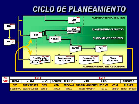 El proceso de Planeamiento de la Defensa se desarrolla en un ciclo de cuatro años, los dos primeros de ejecución propiamente dicha y los dos siguientes de revisión. Las directrices emanadas de la Directiva de Defensa Nacional, es la base que orienta el proceso. Los resultados de cada ciclo de planeamiento y el estado de ejecución de los Planes de Recursos que de él se derivan constituyen los elementos de referencia y realimentación para el siguiente ciclo.