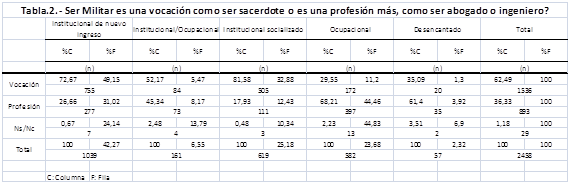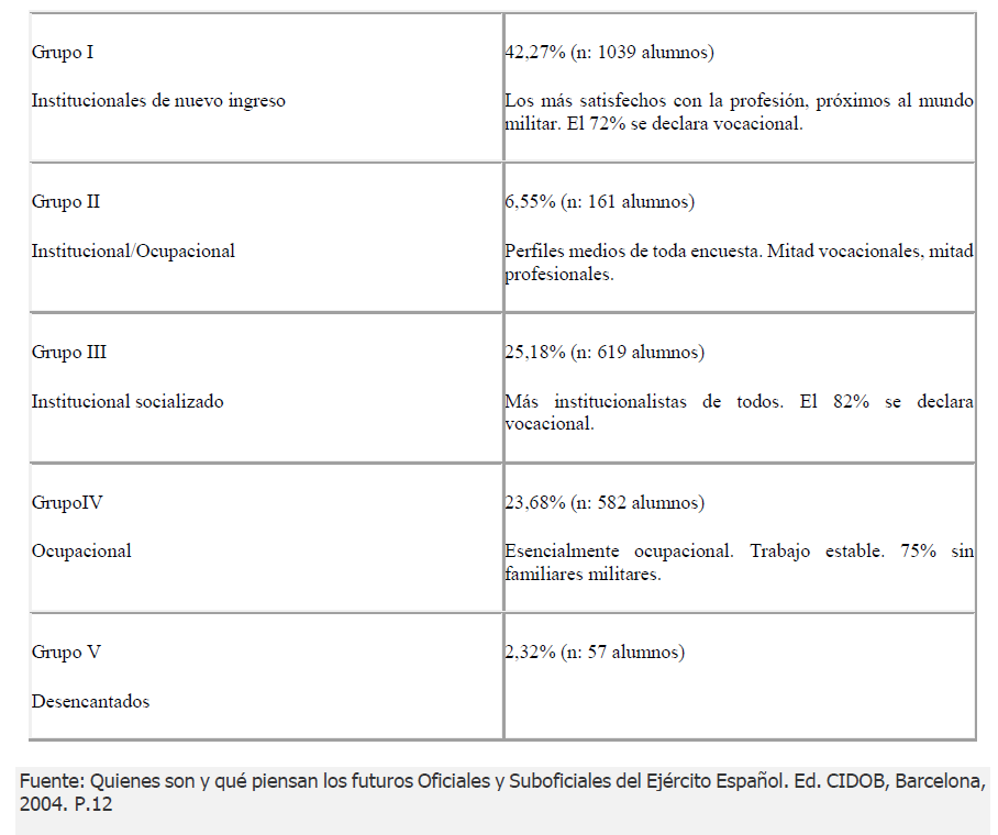 Es insoslayable preguntarse en sociología militar, al igual que en la medicina, la distinción entre institucionalismo y ocupacionalismo. “Una institución, según Moskos y Wood, se legitima en términos de valores y normas, es decir, de un objetivo que trasciende el interés individual a favor de un bien presumiblemente más alto” mientras que “el modelo ocupacional implica la prioridad del propio interés del individuo sobre el de la organización que lo emplea”. Sobre la base teórica de esta diferenciación, los autores definieron cinco grupos principales en torno a dos ejes que vienen dados estadísticamente. Los grupos resultantes fueron los siguientes: