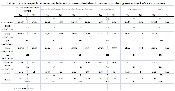 La dicotomía vocación/profesión, tabla 2 y, por otro lado, la dicotomía satisfacción/insatisfacción respecto a sus expectativas de ingreso, tabla 3, fue la siguiente: