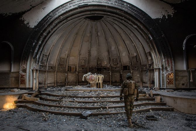 Un combatiente de las Unidades de Protección de la Llanura de Nínive (UPN) camina sobre las ruinas de una iglesia destruida en Qaraqosh, Irak, el 8 de noviembre de 2016. Las UPN son una milicia de cristianos asirios formada a finales de 2014 para hacer frente al ISIS. Qaraqosh es una ciudad mayoritariamente asiria próxima a Mosul que fue tomada por el ISIS en agosto de 2014 y liberada en noviembre de 2016. (Foto: Chris McGrath/Getty Images).