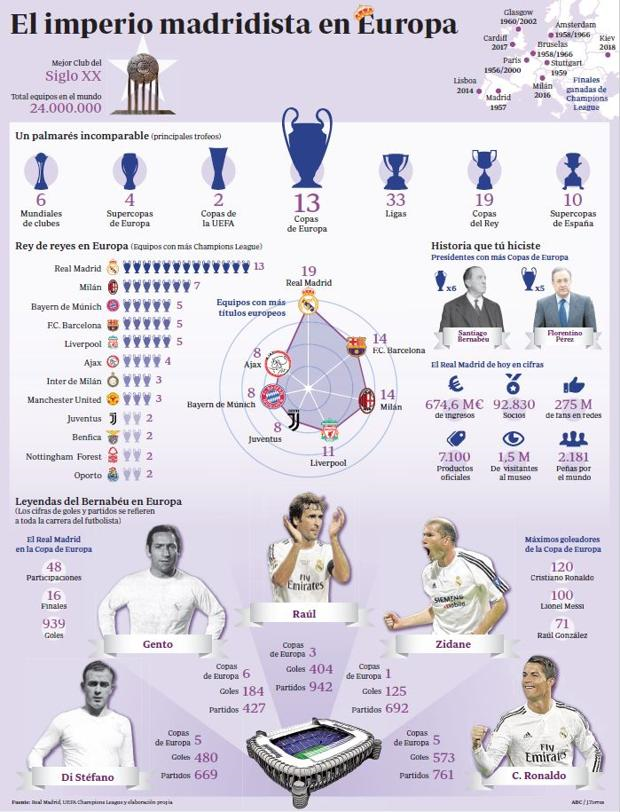 Es un palmarés incomparable, muy superior al resto de grandes equipos. El Madrid lleva 13 Copas de Europa, pero además suma dos UEFAS, cuatro Supercopas de Europa y seis Mundiales de Clubes. Sin olvidar las 33 Ligas, las 19 Copas del Rey y las 10 Supercopas de España. No hay club con semejante historial.