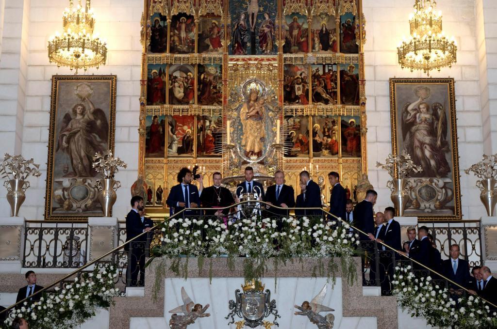 El primer alto fue en la Catedral de la Almudena para ofrecer la Champions a la patrona de la ciudad. El monseñor Jesús Vidal ejerció de anfitrión y se mostró muy cariñoso con el equipo, especialmente con la figura de Zidane: «Ha trabajado siempre desde la humildad para convertirse en el mejor».