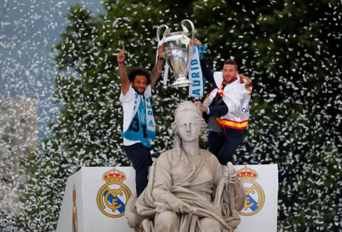 Tras las visitas institucionales, llegó el primer plato fuerte de la noche, la celebración en Cibeles. Allí, Sergio Ramos, Marcelo y Cristiano se apoderaron del micrófono, iniciando los clásicos cánticos blancos, acordándose de su vecino, el Atlético, y engalanando a la Diosa con bandera y bufanda tras ofrecerle la orejona.