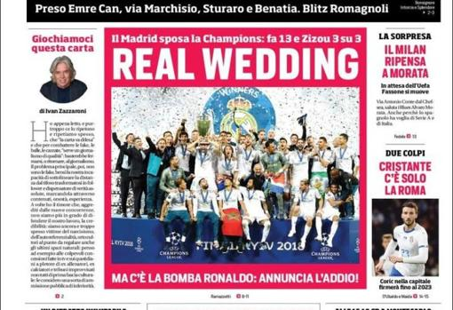 Igualmente el diario ‘Corriere dello Sport’ se fija en la bomba lanzada por Cristiano Ronaldo al término del partido en Kiev, al que se refiere en la portada como «Boda Real».