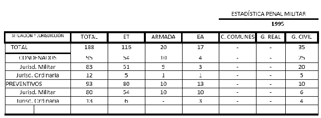 En 1995, la población reclusa de los Ejércitos era ya simbólica, como queda plasmado en el siguiente cuadro, teniendo en cuenta que los Ejércitos estaban constituidos por 200.000 hombres y mujeres: