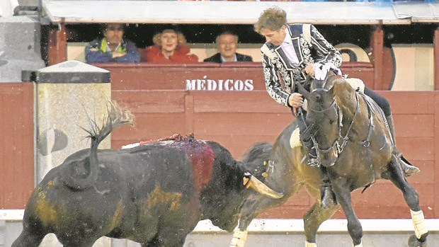 Diluvia de nuevo en el sexto, «Recobero» (‘el que compra aves o huevos para revender’; mejor, con uve). Vuelve a brillar más como amazona que al clavar, desigual. El rejón de muerte cae trasero pero el clamor popular logra la oreja. Los tres igualan sólo en trofeos.