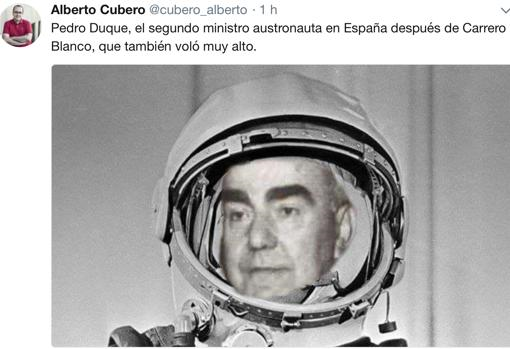 Al hilo de la trayectoria profesional de Pedro Duque, Cubero ha publicado en su cuenta de Twitter un fotomontaje en la que aparece el expresidente franquista Luis Carrero Blanco con traje de astronauta. Y acompaña la imagen con el texto «Pedro Duque, el segundo ministro austronauta en España después de Carrero Blanco, que también voló muy alto», mofa del atentado con bomba que acabó con la vida del expresidente de Franco.