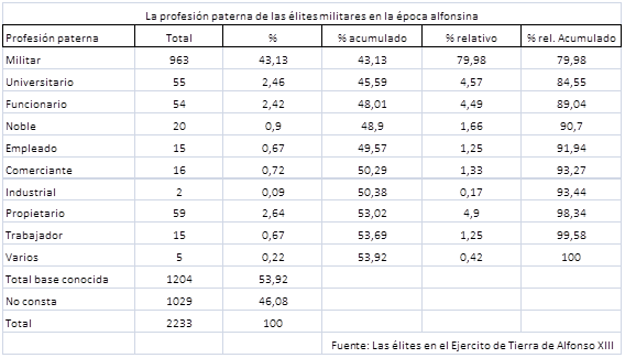 Al margen de estas diferencias para nuestro análisis disponemos, para la época Alfonsina de datos de un trabajo de tesis inédito de 1204 individuos con el resultado de que el dominio de la ascendencia militar es abrumador tanto en el siglo XIX como en el siglo XX según los datos de Busquets.