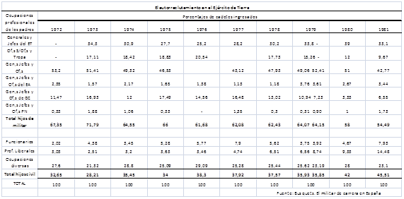 Los militares se agrupan en las categorías siguientes: oficiales generales, oficiales, suboficiales y tropa y marinería. Es obvio que sólo las categorías de libre elección son las que constituyen las e´lites militares: oficiales generales, Coroneles y, en el ámbito de los Suboficiales, los Suboficiales Mayores, no desapareciendo la élite técnica, muy difuminada por su relación con el ascenso al generalato.