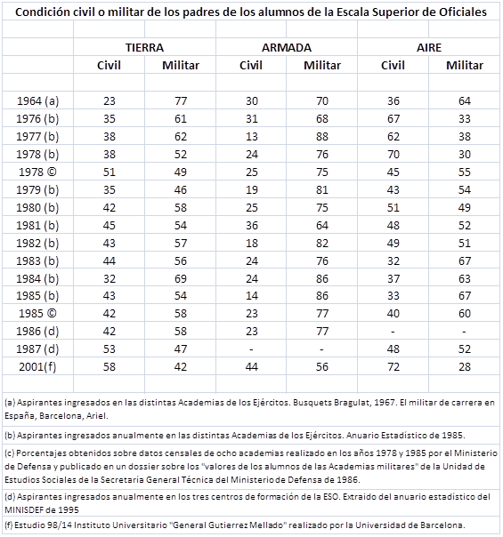 La circunstancia se repite en los estudios relativos al siglo XX, realizados por Busquets y Olmeda coincidiendo prácticamente en el periodo temporal de los últimos años de la época del Generalísimo. Ambos cifran la participación militar entre el 70 y 80% en la década de los sesenta del pasado siglo, con un máximo en el año 1968, momento en el que, según Olmeda Gómez, se inicia una reducción de los progenitores militares, que llegaría a poco más del 61% en 1976, pero que a principios de este siglo todavía se cifra en casi el 43% en el Ejército de Tierra, 56% en la Armada y 28% en el Ejército del Aire.