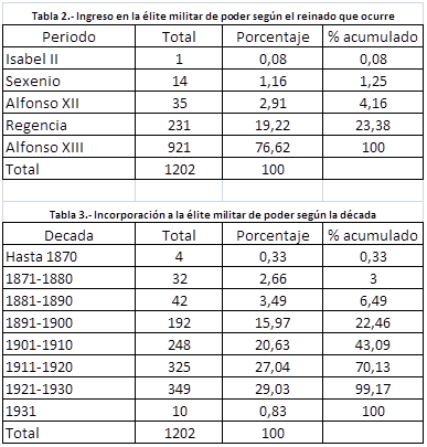 Respecto a la distribución cronológica de las élites son las que se muestran en las siguientes tablas 2 y 3, en las que se puede ver que fue en el reinado de Alfonso XIII, cuando se incorporan a las élites el mayor número de Generales, oficiales de Estado Mayor y Caballeros de San Fernando.