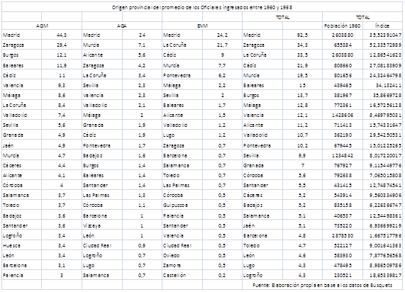 El origen provincial de los oficiales presenta unos máximos que pueden observarse en la tabla siguiente, en la que se cita la media de ingreso anual en cada uno de los tres Ejércitos y en el total de las Fuerzas Armadas, así como un índice de reclutamiento en función de la población de cada provincia. He escogido el periodo de 1960 a 1968, por ser los oficiales generales actuales, es decir, los que ingresaron en aquel decenio, son las élites del momento, formadas durante el regimen personalista del Generalisimo y han sido las élites técnicas del asentamiento de la transición.
