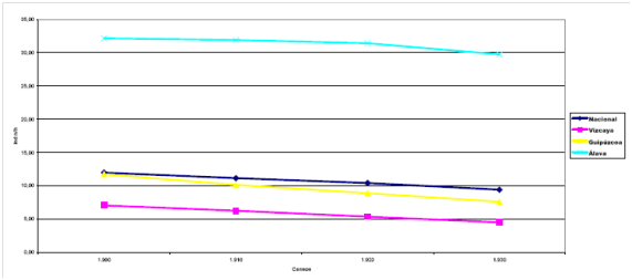 También hay que destacar la fuerte implantación de las élites por provincias en Álava, que partiendo de un índice de 32,16 en 1900, justo por detrás de Madrid, se coloca en primer lugar en 1930 con un índice de 29,76. Evolución que contrasta con las otras provincias Vascas, que mantienen su índice por debajo de la media nacional durante todo el reinado, como muestra el gráfico siguiente: