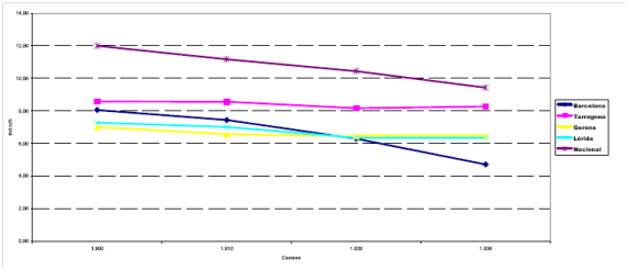 Estas diferencias interprovinciales chocan con la uniformidad de la escasa repercusión de las élites en las cuatro provincias catalanas, siempre por debajo de la media nacional como se puede ver en el siguiente gráfico: