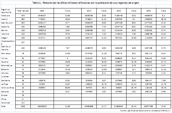 Especialmente significativo es el caso de Cataluña y Vascongadas. Los catalanes, situados en el cuarto puesto en valor absoluto, tienen un índice muy bajo- no superando el 8 al iniciarse el reinado de Alfonso XIII y cayendo al 5,5 al final de éste. En cambio, Vascongadas, en el decimo lugar en valores absolutos, presenta uno de los índices más altos en 1900, ascendiendo al sexto lugar, justo detrás de La Rioja y Baleares y muy próxima a ellas; por el contrario, en 1930, sólo alcanza el 8,52, inferior al indicador general, pero únicamente baja un puesto hasta el séptimo. Aún invirtiendo los papeles, las dos regiones tienen una aportación más significativa que la que señalan Bastarreche y Verdejo, para el ejército del siglo XIX, o Busquets para el del siglo XX, como queda demostrado en su tesis doctoral “El militar de carrera en España”.