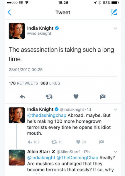 La alianza cada vez más estrecha entre los partidos políticos y las organizaciones de izquierda de Europa y Estados Unidos y los movimientos islamistas más retrógados y reaccionarios se cimenta en un objetivo compartido: acabar con la tradición judeocristiana y poner fin al legado grecoromano sobre el que se han levantado los valores tradicionales de Occidente a lo largo de los siglos. Como ejemplo de esta deriva, dos ejemplos recientes sumamente ilustrativos: la conocida periodista británica India Knight, colaboradora habitual de “The Sunday Times”, escribía hace unas horas un tuit, posteriormente borrado, en el que invitaba a los terroristas islamistas a asesinar a Donald Trump; hace unos días, un manifestante “antifascista” participante en una de las protestas anti-Trump organizadas en Estados Unidos fue capturado en una fotografía mostrando en su teléfono móvil, de forma amenazante, una bandera del autodenominado Estado Islámico.
