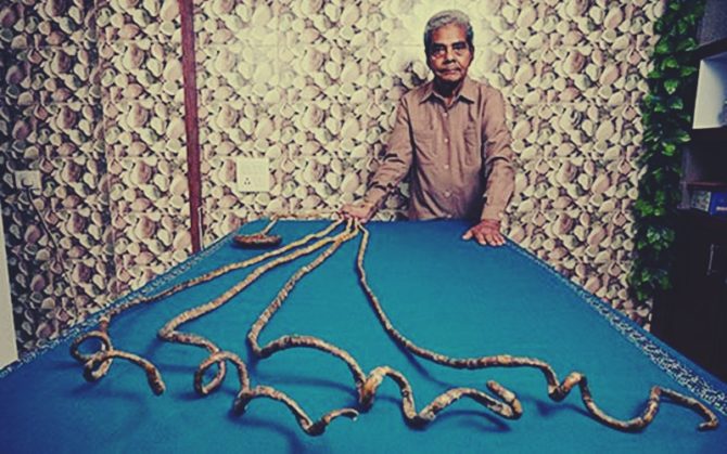 Y así fue. El indio se sintió retado, o quizás inspirado, por lo que le dijo su maestro, tanto así que las uñas de su mano izquierda llegaron medir casi nueve metros de largo. Su uña más larga era la del dedo pulgar.