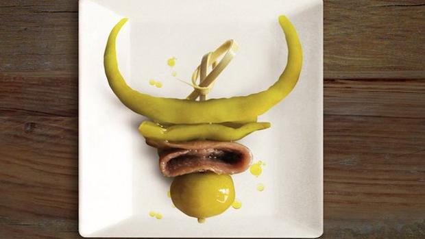 La “gilda”, uno de los “pintxos” icónicos de San Sebastián, adquiere forma de asta y cabeza de toro en el cartel que ilustra la próxima Semana Grande.