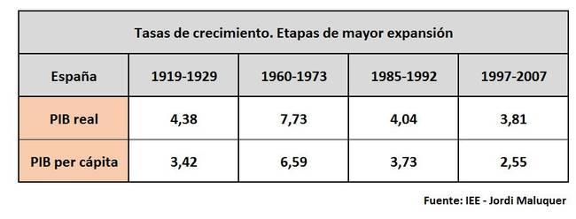 Lo que no está tan claro es que vaya a ser “la mejor oportunidad” de nuestra historia. Para eso el salto debería ser excepcional. Porque España ha tenido varios momentos de crecimiento muy pronunciado. En el siguiente cuadro, del libro España en la economía mundial, de Jordi Maluquer, se recogen los episodios más destacados: