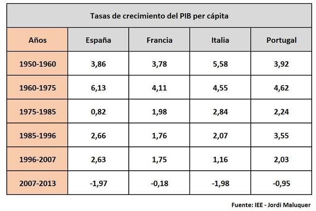 En todos los períodos, el crecimiento es muy importante, mucho más elevado del que disfrutamos ahora mismo. De hecho, recordemos que el año pasado el PIB español se disparó un 3,2% y ya se consideró una tasa complicada de mantener para una economía rica. Imagínense lo que supuso el 7,73% de media del período 1959-1973 y el 6,59% si se mide en términos per cápita. Parece imposible que ahora lleguemos a esas cifras. Probablemente, ni siquiera Montoro lo crea. También es cierto que cuanto más rico eres más complicado es mantener una tasa de crecimiento por encima del 4-5%. No hay demasiados países desarrollados que lo hayan conseguido de forma sostenida.