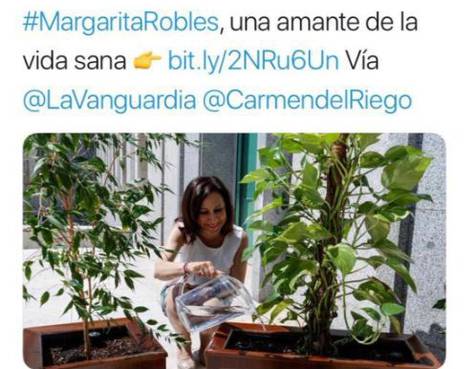 El Ministerio de Defensa ha borrado de su cuenta de Twitter el enlace a un perfil de Margarita Robles como “amante de la visa sana” sobre una fotografía de ésta regando las plantas en la terraza Ministerio, tras las críticas del PP, Podemos y Ciudadanos.