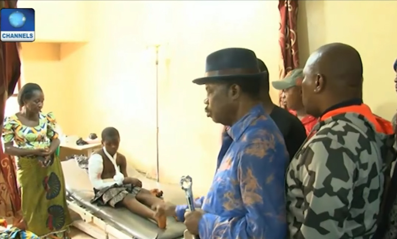 El gobernador del estado nigeriano de Anambra, Willie Obiano (en el centro), visita a un superviviente del mortífero ataque contra la iglesia católica de San Felipe, en Ozubulu, el 11 de agosto de 2017.