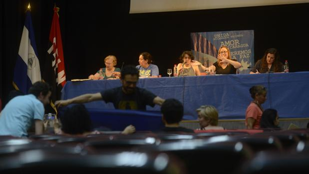 La senadora de Izquierda Unida Vanessa Angustia fue la única representante política española entre los ponentes de la mesa. Flanqueados por la bandera de Nicaragua y el Frente Sandinista, el evento arrancó con la visualización de dos vídeos enviados desde el otro lado del charco. En el primero se pudo escuchar el mensaje de Carlos Fonseca, hijo de un líder histórico del partido gubernamental, quien cerró su discurso con un sintomático mensaje: «Patria libre o morir».