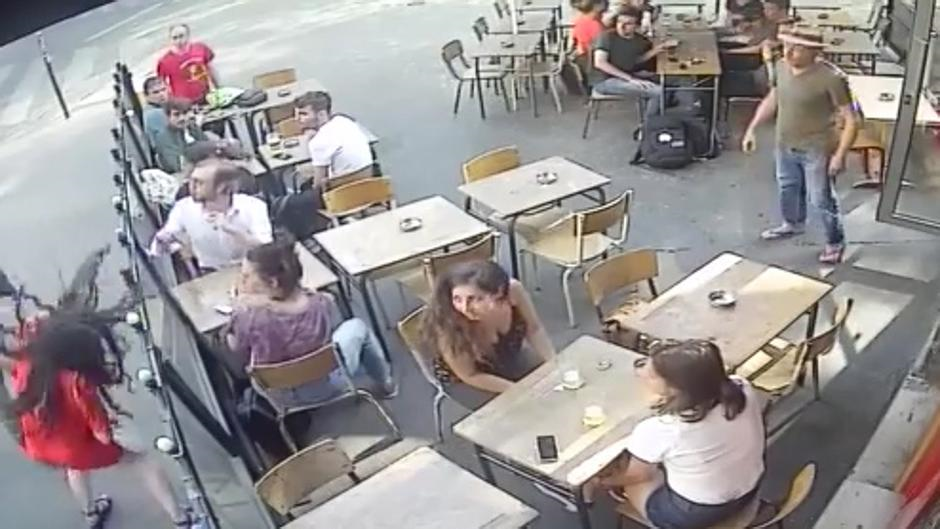 En la grabación se muestra como el hombre coge un cenicero y se lo tira sin llegar a darle, y al ver que la joven contesta de nuevo el agresor acuede a ella y le propina un fuerte golpe ante el asombro de las personas que estaban en el establecimiento. Varias personas se encararon con el agresor antes de que escapase.