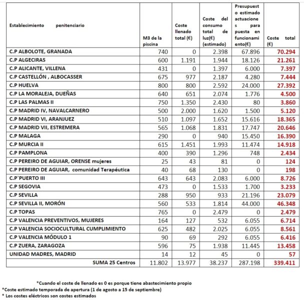 Asimismo, señala que la apertura de estas piscinas, además del gasto que conlleva, requiere destinar a funcionarios en la vigilancia y custodia de la misma durante el tiempo que se encuentre abierta, cuando en estos momentos “los servicios se están cubriendo bajo mínimos, y los centros no pueden perder o destinar funcionarios a la vigilancia y control de los internos y a su vez a la piscina, con lo que esto supone para la seguridad y convivencia ordenada de los centros”.