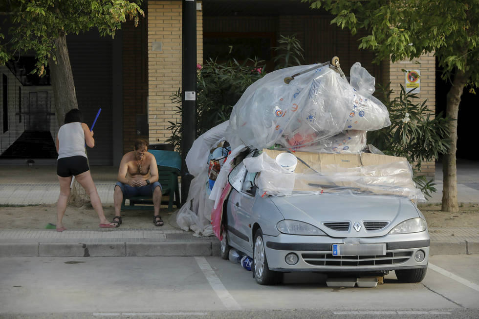 Sillas de terraza, una piscina hinchable, un carrito de la compra, un patinete, decenas de garrafas de agua… María Luisa y Carlos han ido acumulando gran cantidad de enseres (la mayoría recogidos en los contenedores, según los vecinos) durante las últimas semanas en torno a su Renault Megane. De hecho, ayer mismo se quejaban de que la Policía Local les había obligado a tirar a la basura varias de sus pertenencias, entre las que había “productos de limpieza recién comprados”, porque María Luisa afirma que intenta tener los alrededores del vehículo lo más adecentados posible.