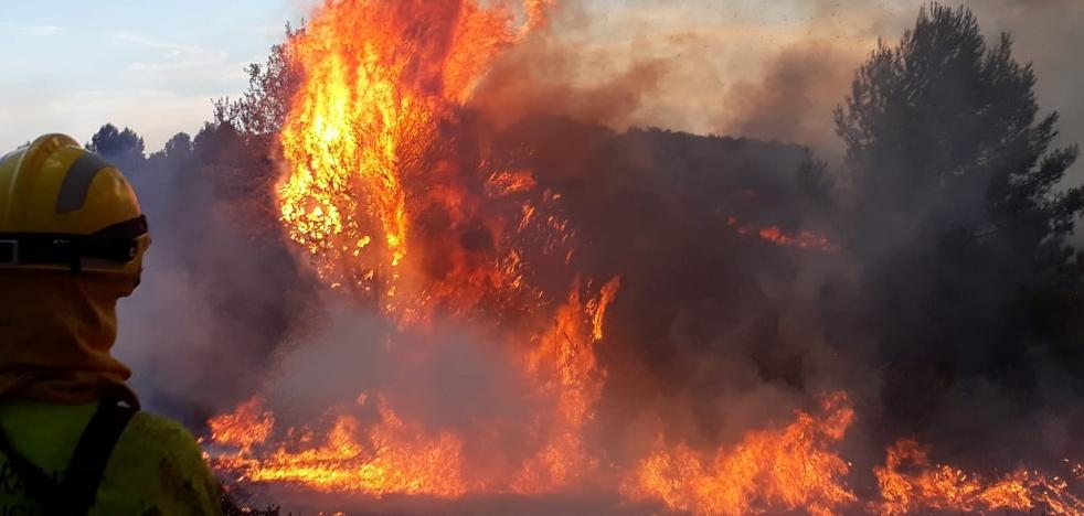 El incendio declarado el lunes entre Llutxent y Pinet, en la comarca de la Vall d’Albaida, sigue activo y sin control.