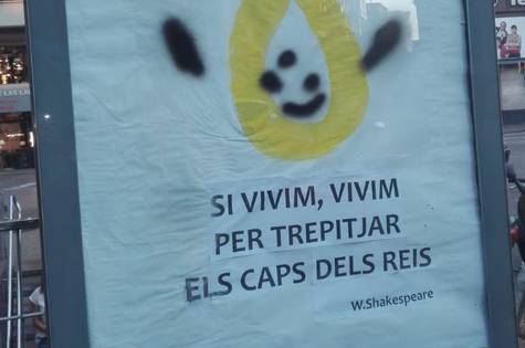 El cartel, que evoca uno de los símbolos independentistas más utilizados para reclamar la libertad de los políticos presos, tiene un fondo blanco sobre el que aparece una soga amarilla y la frase, en catalán, “Si vivimos, vivimos para pisar las cabezas de los reyes”.