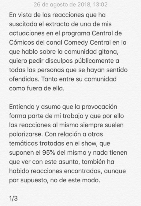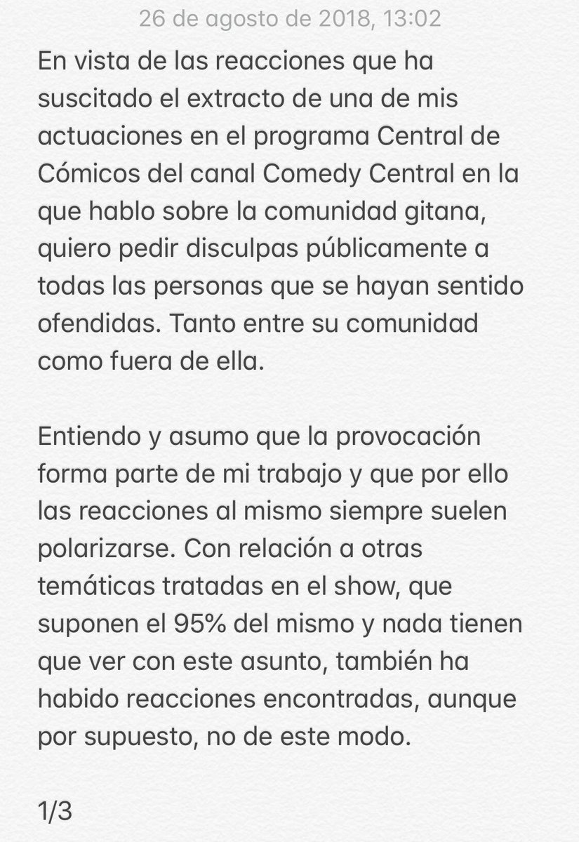En la nota, que ha sido compartida ya por medio millar de usuarios de la red social, el cómico reconoce que siempre ha habido posiciones «encontradas» respecto a «otras temáticas» del show, aunque «no de este modo». «A mí personalmente no me ofende ningún chiste, ya ataque a mi procedencia, físico, valores o creencias, más allá de encontrarlo más o menos gracioso y/o certero, pero comprendo que no todo el mundo afronta el humor de la misma manera», ha agregado.