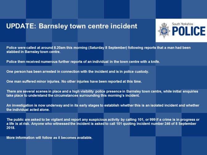 La Policía de Reino Unido ha detenido este sábado a una persona después de un apuñalamiento en el centro de la localidad de Barnsley, suceso que se ha saldado con un herido leve.